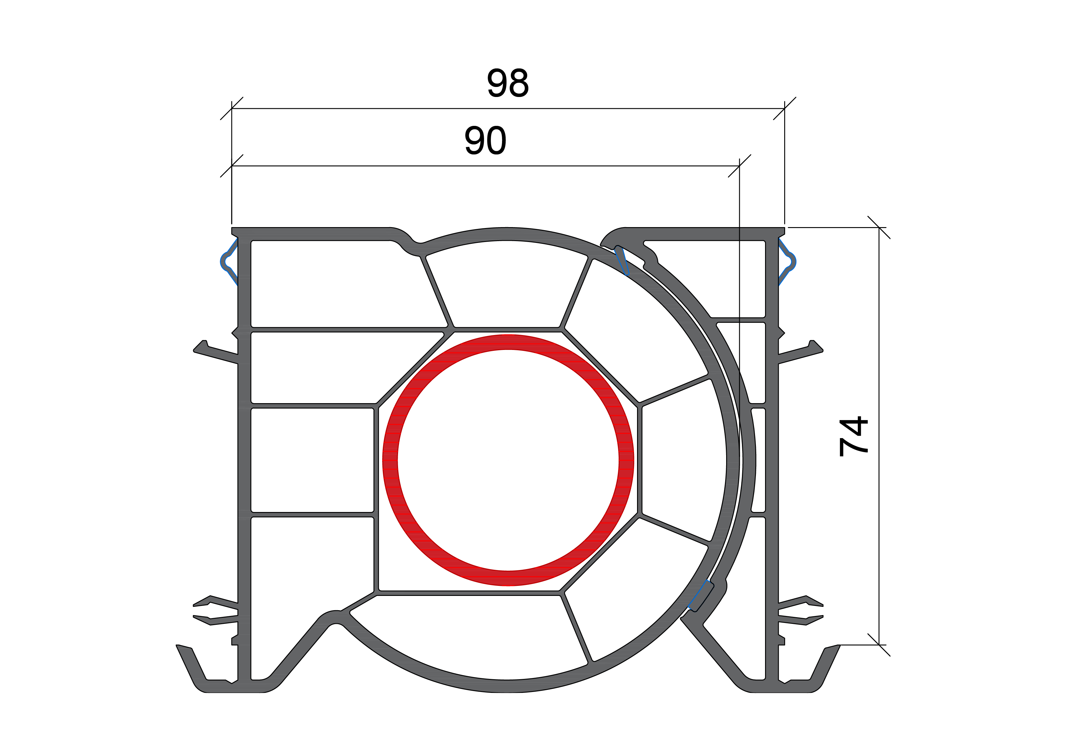Der Einsatz dieses Eckprofils verlängert die Rahmenaußenmaße der zu verbindenden Rahmen um 90 + 8 mm (siehe Systembeschreibung für genauen Bemaßung). Bitte berücksichtige dies bei der Konfiguration der Fensterelemente.